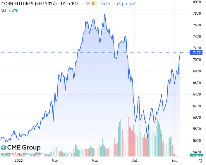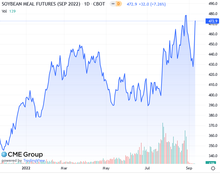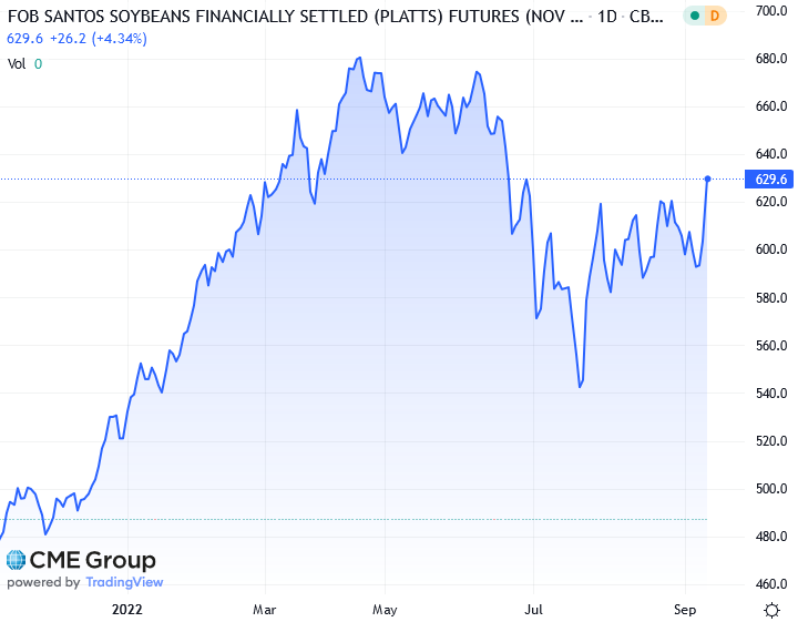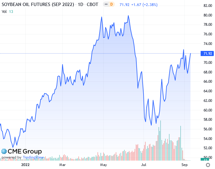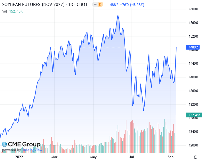 Базовый ноябрьский контракт закрылся на 76 центов выше по $14,88-1/4 за бушель. Самый активный контракт достиг максимальной цены с 30 июня на уровне $14,90-1/4. Декабрьское соевое масло CBOT выросло на 1,67 цента до 66,49 цента за фунт. Министерство сельского хозяйства США в своем ежемесячном отчете сообщило, что запасы кукурузы и сои в США упадут до многолетнего минимума, так как жаркая и сухая погода в августе в западных районах возделывания сократит потенциал урожая обеих культур. Конечные запасы сои в США на 2022/23 г. прогнозировались на уровне семилетнего минимума. из 200 миллионов бушелей.