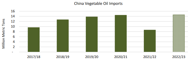 Импорт растительного масла в Китай сократится в 2021/22 году но прогнозируется восстановление в 2022/23 году. Ограничения, связанные с COVID в Китае, замедление экономического роста и более высокие мировые цены на сырьевые товары ослабили спрос страны на переработку масличных культур, шрот и потребление растительного масла. Высокие мировые цены на растительное масло в 2021/22 году стали ключевым фактором, приведшим к 40-процентному сокращению импорта растительного масла в Китай.