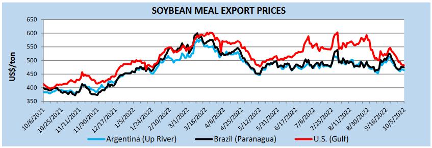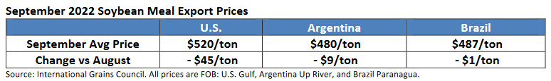Премии на соевый шрот в США по сравнению с Южной Америкой снизились в сентябре. Среднемесячные цены на соевый шрот в США снизились на фоне сильного укрепления американской валюты, снижения цен на сою и увеличения Аргентина экспортирует сою. Для сравнения, цены в Южной Америке были стабильными.