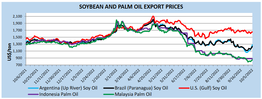 Внутренний спрос на соевое масло для производства биодизельного топлива продолжал поддерживать цены в США, которые упали не так резко, как южноамериканское соевое масло, подавленное падением мировых цен на растительное масло. Цены на пальмовое масло продолжили тенденцию к снижению с рекордно высоких значений в начале этого года, что связано с корректировками экспортной политики Индонезии. Среднемесячные цены на пальмовое масло в этом месяце упали до самого низкого уровня с ноября 2020 года, сохранив скидку к другим растительным маслам.