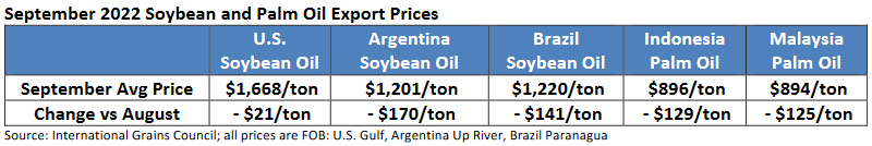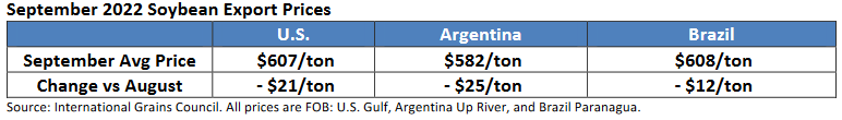 Средние цены на сою для основных экспортеров немного снизились в сентябре по сравнению с предыдущим месяцем. Увеличение экспорта Аргентины в ответ на временное стимулирование экспорта правительством по льготному обменному курсу "соевый доллар" оказало понижательное давление на весь рынок сои. Кроме того, продолжающееся укрепление доллара США и более высокие, чем ожидалось, запасы сои, опубликованные NASS в отчете о запасах и мелких зернах, оказали дальнейшее понижательное давление на цены.