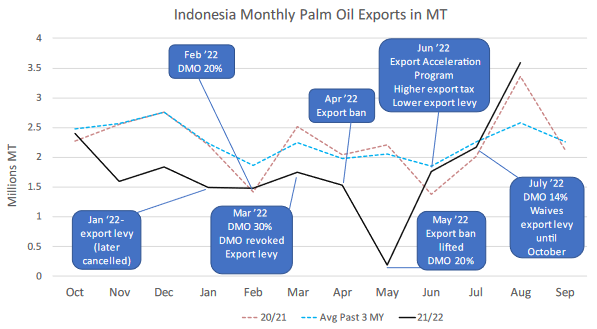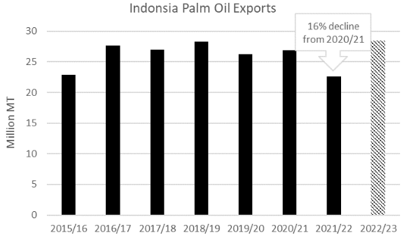 Пересмотр политики Индонезии в области экспорта пальмового масла в 2022 году привел к снижению общего объема экспорта в 2021/22 маркетинговом году, который в настоящее время оценивается в 22,65 млн тонн, что является самым низким уровнем с 2015/16 года. Правительство Индонезии начало вводить меры по ограничению экспорта в январе 2022 года в ответ на высокие внутренние цены на растительное масло. Эта политика сначала включала экспортные сборы для субсидирования растительного масла, прежде чем перейти к политике обязательств на внутреннем рынке (DMO) в феврале 2022 года.