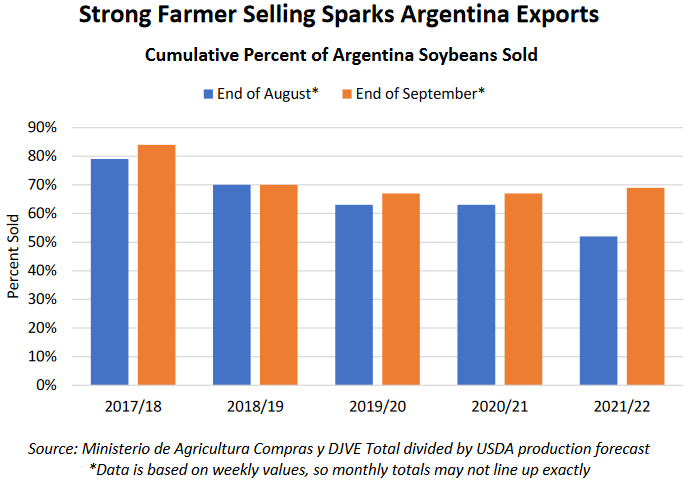 В результате в сентябре продажи сои аргентинскими фермерами резко возросли. По данным Буэнос-Айресской биржи в сентябре, фермеры продали более 16 миллионов тонн соевых бобов, или 37 процентов от общего прогнозируемого урожая аргентинской сои в 2021/22 годах. Некоторая часть этого тоннажа сведет на нет продажи, которые произошли бы в период с октября по январь, поскольку фермеры, которые намеревались продавать позже в этом году, воспользовались благоприятным обменным курсом, сообщает oilworld.ru со ссылкой на USDA.