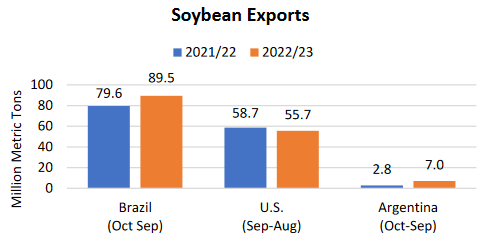 Прогноз экспорта Аргентины в этом месяце вырос на 2,3 млн тонн до 7,0 млн. Если это будет реализовано, Аргентина снова станет третьим по величине экспортером сои в мире после отставания от Канады, Уругвая и Парагвая в последние годы. Ожидается, что значительный экспорт сои снизит имеющиеся запасы для экспорта сырья и продуктов переработки в октябре-сентябре текущего года. Однако, несмотря на пересмотр в сторону понижения в этом месяце, по прогнозам, урожай по-прежнему будет расти в 2022/23.