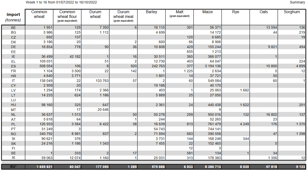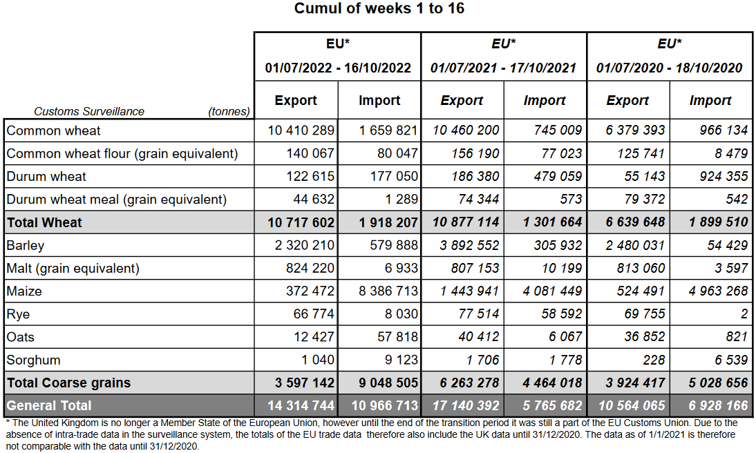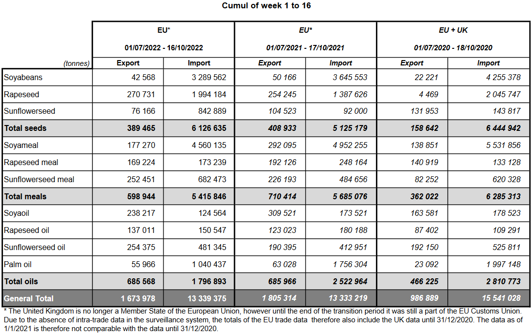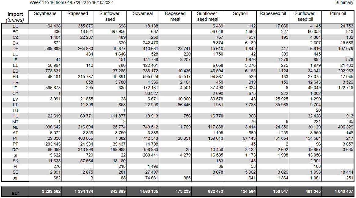 ЕС. Импорт - экспорт зерновых, масличных, растительного масла, шрота. Оперативные данные на 16.10.2022