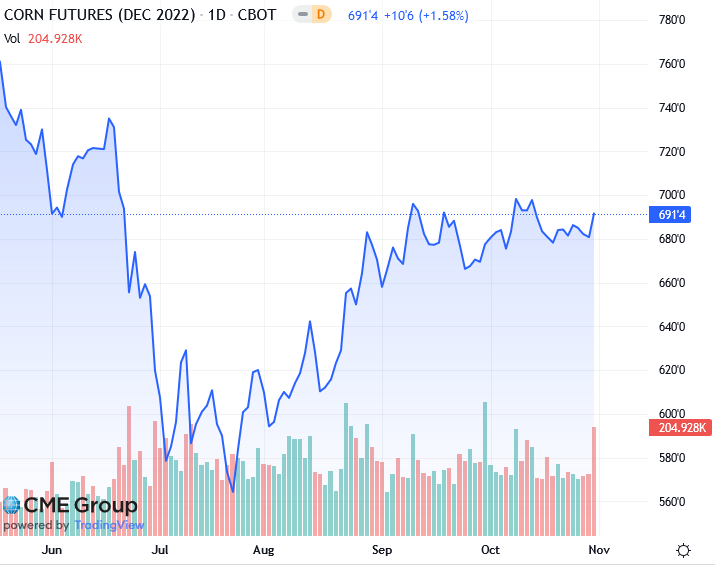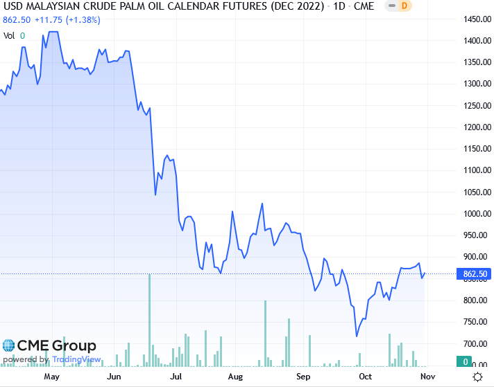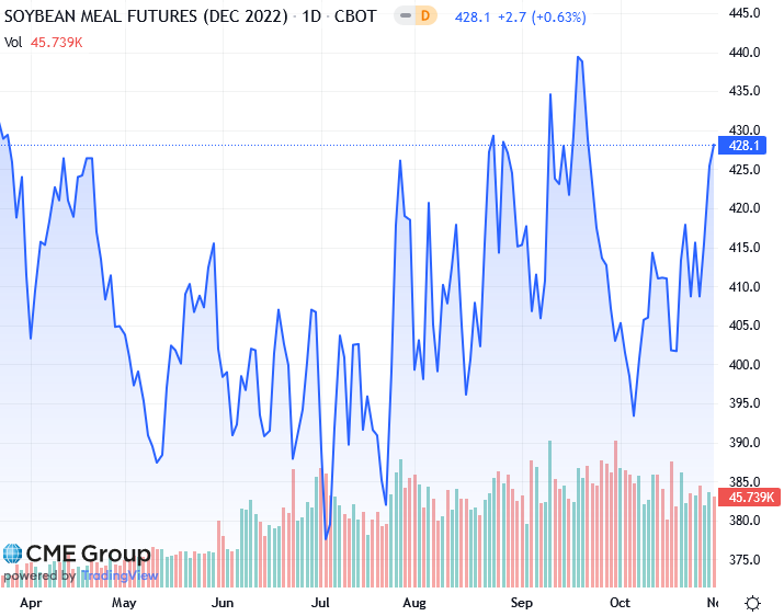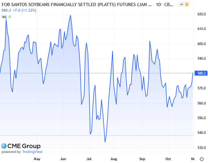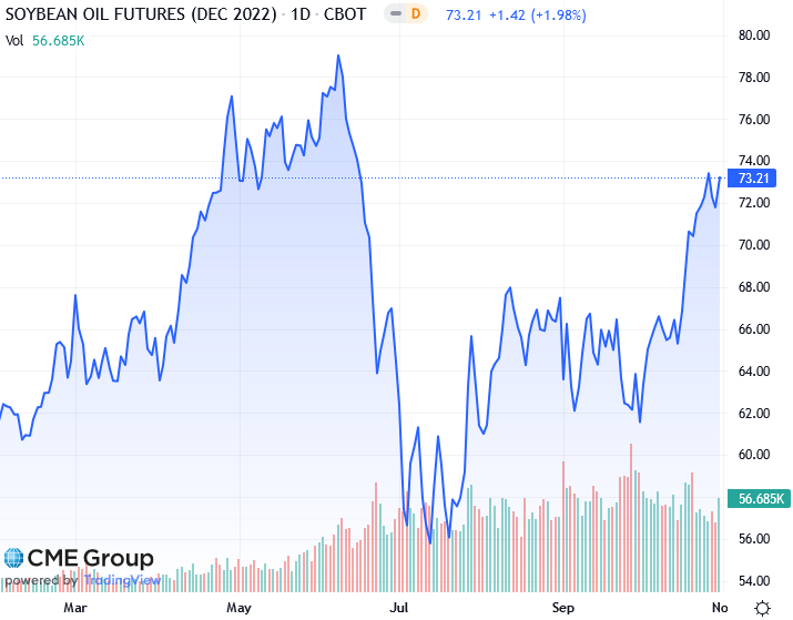 Фьючерсы на соевое масло на CBOT выросли в октябре вместе с другими мировыми рынками растительных масел на фоне опасений по поводу предложения и укрепления цен на сырую нефть. 27 октября соевое масло достигло четырехмесячного максимума в 73,97 цента за фунт.