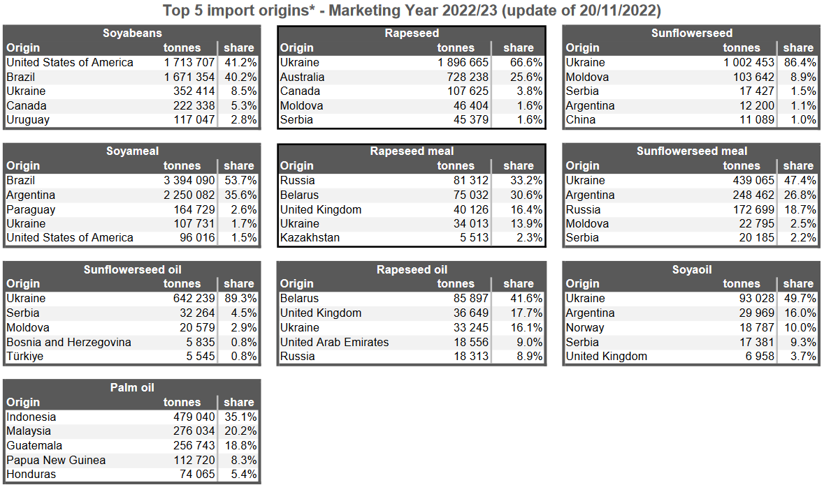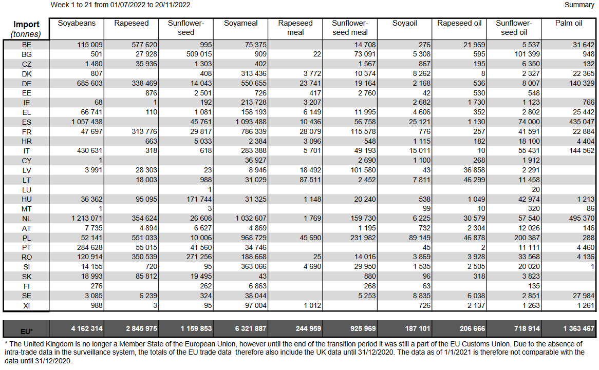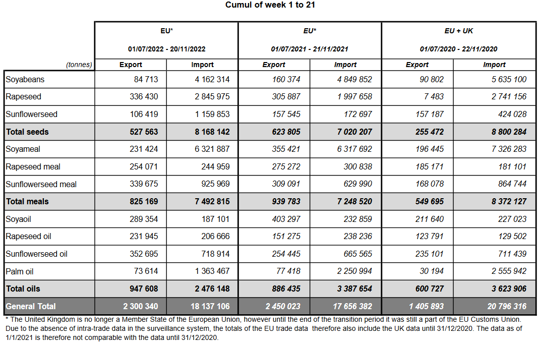 ЕС. Импорт - экспорт зерновых, масличных, растительного масла, шрота. Оперативные данные на 20.11.2022