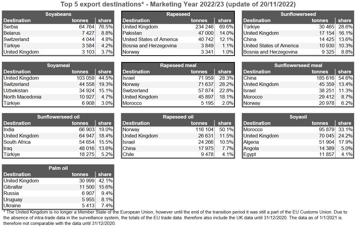 26.10.22 ЕС. Импорт - экспорт зерновых, масличных, растительного масла, шрота. Оперативные данные на 23.10.2022