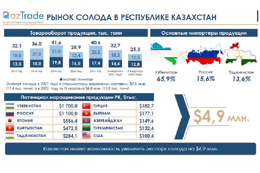 Казахстанский экспорт солода в 2021 году в стоимостном выражении составил $7,5 млн (17,4 тыс. тонн), а в 2022 году за III квартала - $6,8 млн (12,8 тыс. тонн). Казахстан имеет возможность увеличить экспорт на $4,9 млн. Об этом сообщает ElDala.kz со ссылкой на Центр развития торговой политики QazTrade.
