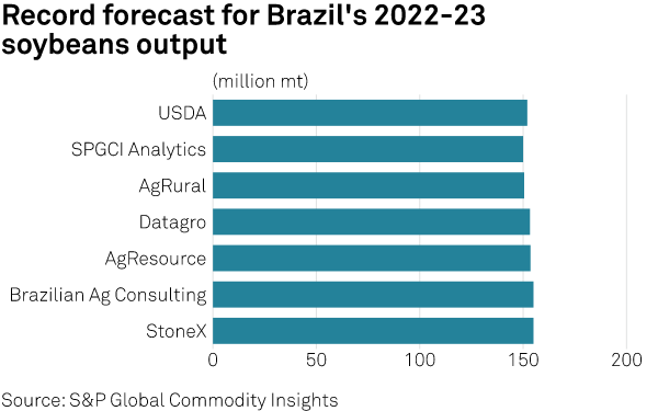 Бразилия находится на пути к рекордно высокому урожаю сои в 2022-23 маркетинговом году (январь-декабрь 2023), согласно прогнозам консультантов по сырьевым товарам и государственных учреждений, что, вероятно, сигнализирует о надвигающемся переизбытке предложения, который сохранится по крайней мере до середины 2023 года, пишут аналитики S&P Global.