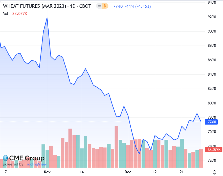 Пшеница CBOT закрыла день снижением на 11,1/2 цента, установившись на уровне 7,74 доллара за бушель, в то время как кукуруза подешевела на 3,1/4 цента до 6,79-1/2 доллара за бушель.