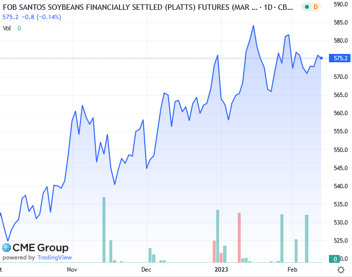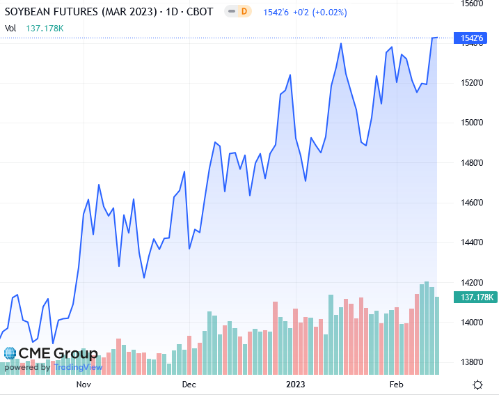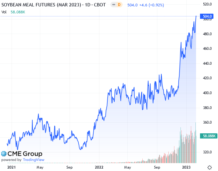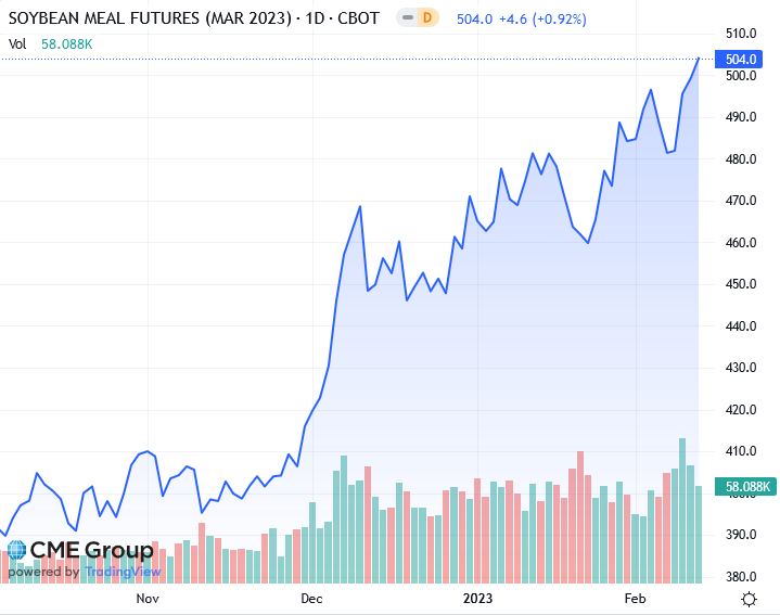 Мартовский соевый шрот Чикагской товарной биржи подорожал на 4,60 доллара по цене 504 доллара за короткую тонну после достижения 508,20 доллара, что является максимумом контракта и самым высоким показателем на непрерывном графике самого активного контракта на соевый шрот с июня 2014 года.