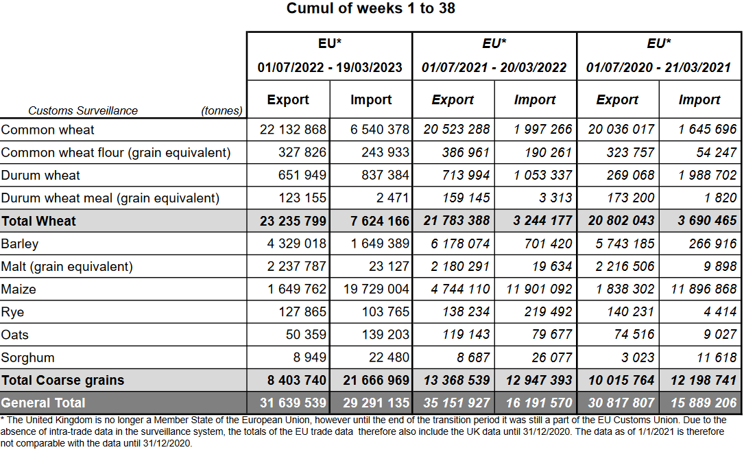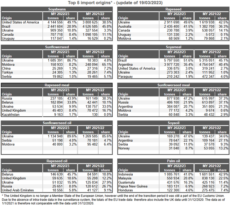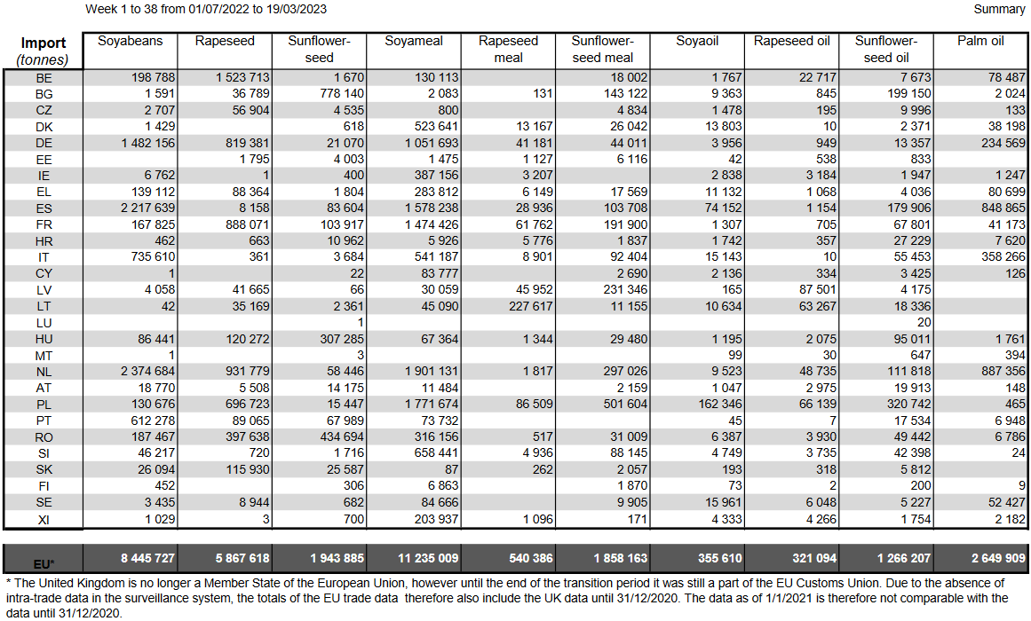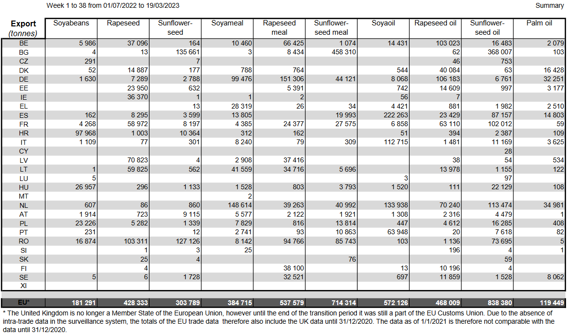 ЕС. Импорт - экспорт зерновых, масличных, растительного масла, шрота. Оперативные данные на 15-19.03.2023