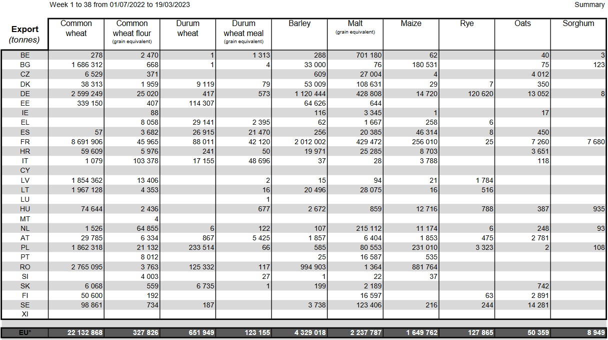 Экспорт мягкой пшеницы из Европейского Союза в сезоне 2022/23, который начался в июле, к 19 марта достиг 22,13 млн тонн по сравнению с 20,52 млн тонн на той же неделе в 2021/22 году.
