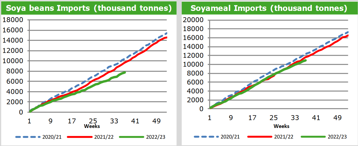 Импорт сои в Европейский Союз в сезоне 2022/23, начавшемся в июле, к 19 марта достиг 8,45 млн тонн, что на 14,6% меньше, чем 9,89 млн тонн на той же неделе прошлого сезона, согласно опубликованным данным Европейской комиссии во вторник. Импорт рапса в ЕС на данный момент в 2022/23 году достиг 5,87 млн тонн, что на 54% больше по сравнению с 3,81 млн тонн годом ранее. Импорт соевого шрота блоком за тот же период составил 11,24 млн тонн, что на 4,6% меньше по сравнению с 11,78 млн тонн в предыдущем сезоне, а импорт пальмового масла составил 2,65 млн тонн, что на 29% ниже 3,73 млн годом ранее. Тем не менее, Комиссия заявила, что по-прежнему испытывает проблемы со сбором данных о торговле зерном из Германии и Италии. Данные об экспорте, представленные Германией за ноябрь, могут быть неточными после перехода страны на новую систему декларирования, в то время как данные об импорте Италии выросли только до 13 января, говорится в примечании.