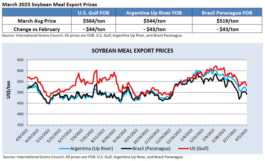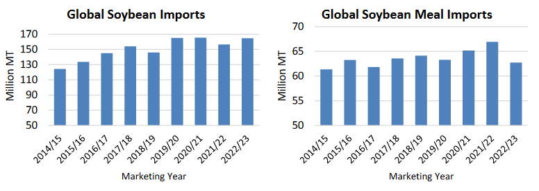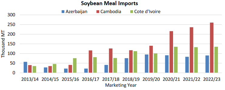 Начиная с этой публикации, база данных Министерства сельского хозяйства США по производству, поставкам и дистрибуции была расширена за счет включения балансовых отчетов по соевому шроту для Азербайджана, Камбоджи и Кот-д'Ивуара, начиная с 2013/14 маркетингового года. По прогнозам, в 2022/23 году (октябрь-сентябрь) три страны импортируют в общей сложности 485 000 тонн соевых бобов. Эти дополнения объясняют значительную часть изменений в торговом балансе соевого шрота в этом месяце. Все изменения см. файл.