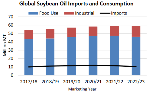 На торговлю соевым маслом оказывает дополнительное давление объявление о том, что доля биодизельного топлива в Бразилии была увеличена до 12%, что оказывает дополнительное давление на экспортные поставки. В результате сокращения мировых экспортных поставок и более высокого промышленного потребления, по прогнозам, доля соевого масла в мировом потреблении растительных масел упадет ниже 30 процентов в 2022/23 году впервые почти за десятилетие. Несмотря на снижение потребления соевого масла в пищевых продуктах, прогнозируется рост мирового потребления растительных масел в 2022/23 годах за счет увеличения потребления пальмового, рапсового и подсолнечного масел.