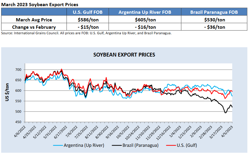 Средние цены на сою в марте снизились у всех основных экспортеров в ожидании предстоящего рекордного урожая в Бразилии. Цены в Бразилии упали сильнее всего, увеличив скидку по сравнению с другими экспортерами. Следуя тенденции нескольких месяцев, мировые экспортные цены на сою также подверглись понижательному давлению из-за цен на соевое масло на фоне обильных поставок других растительных масел, поскольку рентабельность переработки была менее привлекательной для переработчиков. По состоянию на начало апреля соевое масло в Южной Америке продается с премией к пальмовому маслу. Цены на соевый шрот также были ниже в среднем в этом месяце впервые с декабря, сообщает oilworld.ru со ссылкой на USDA.