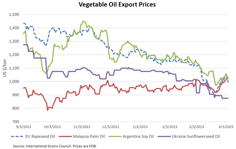 Спрос на шрот в последнее время увеличил рентабельность переработки рапса в ЕС, учитывая сокращение экспортных поставок соевого шрота в Аргентине. Цены на рапсовый шрот продолжают расти торгуясь со скидкой по сравнению с соевым шротом с прошлой весны, при этом скидка увеличивается с начало календарного года. Цены на рапсовое масло в ЕС также впервые упали ниже цен на пальмовое масло, что способствует увеличению доли сырья из рапсового масла в биотопливе. производство и предоставление альтернативного варианта потребления продуктов питания.