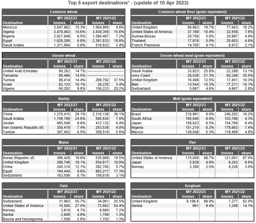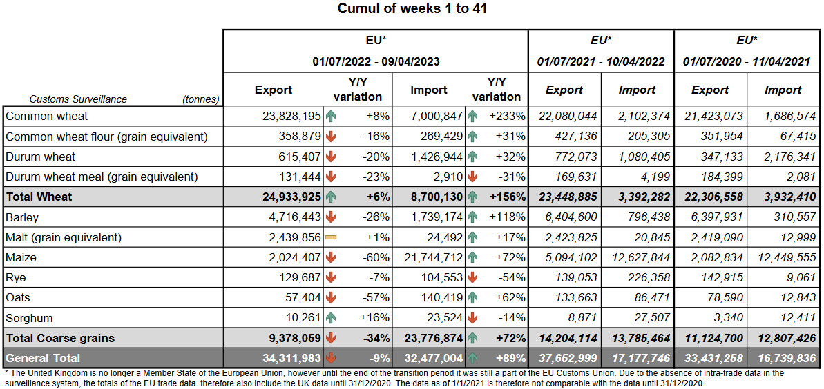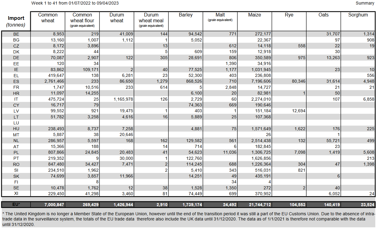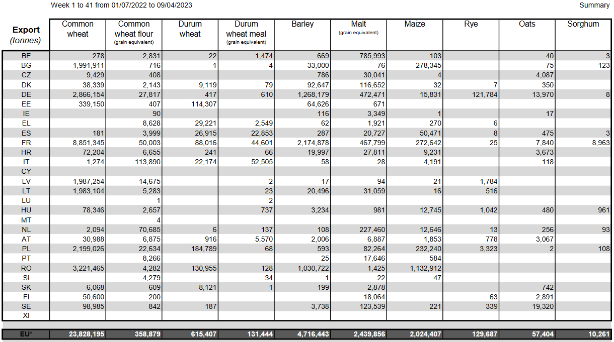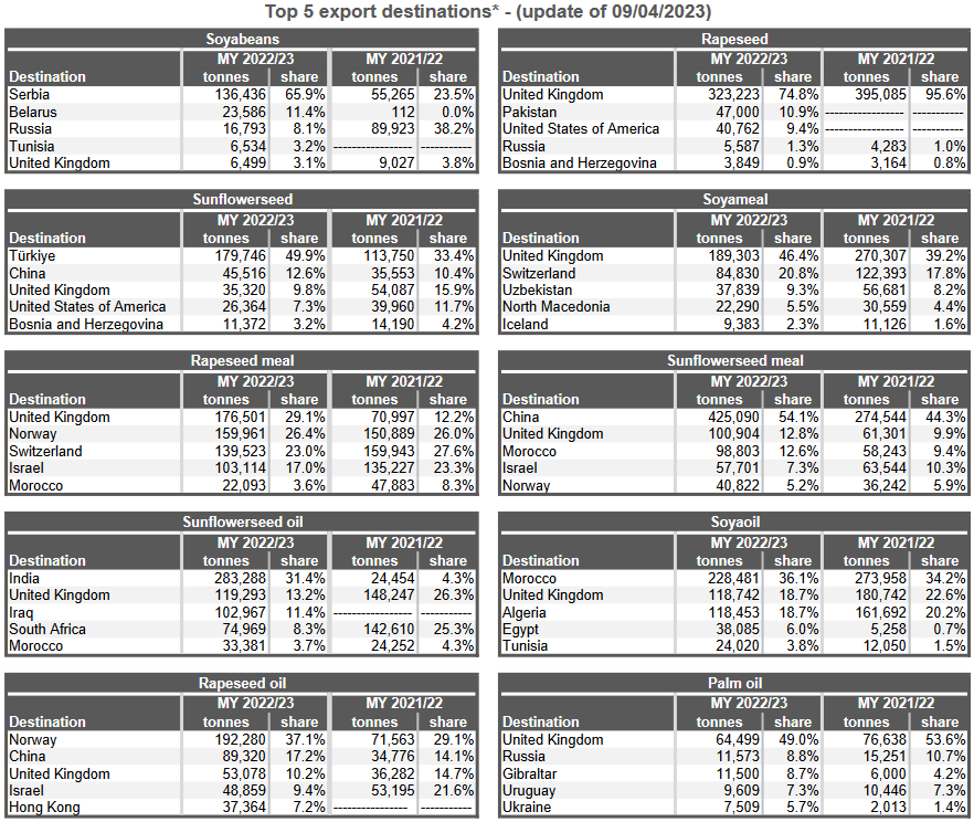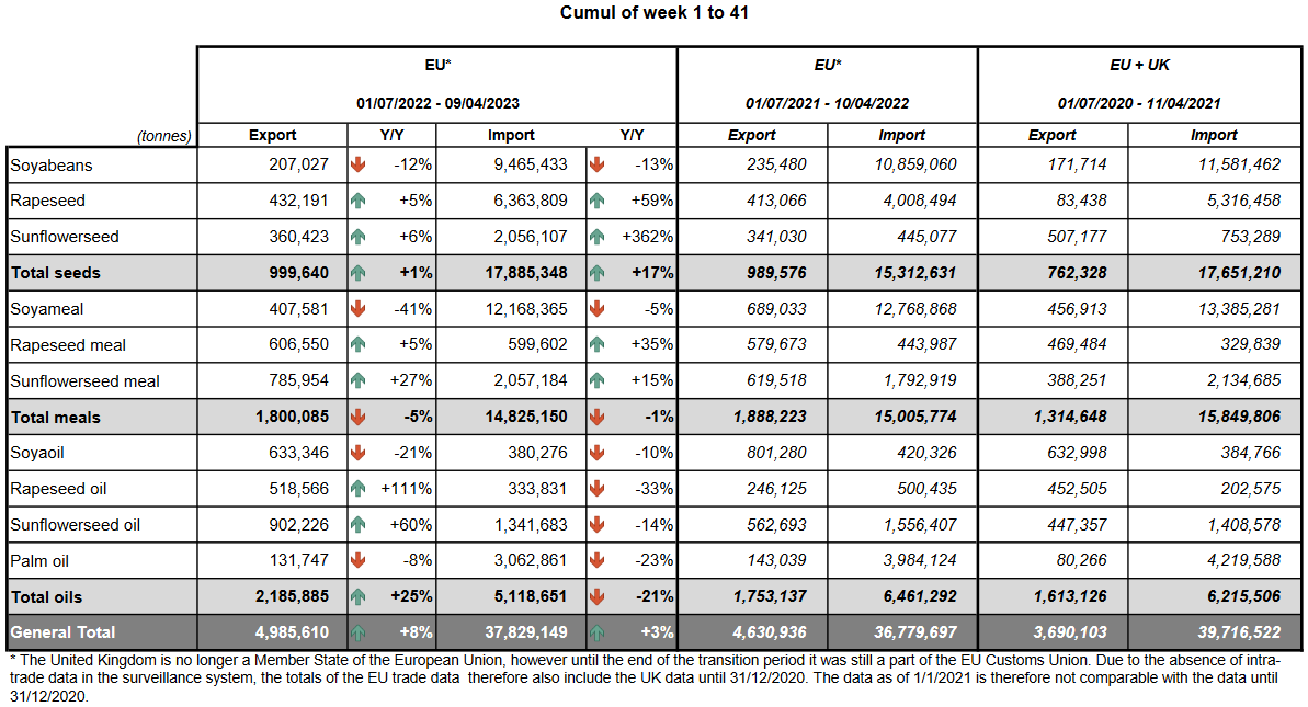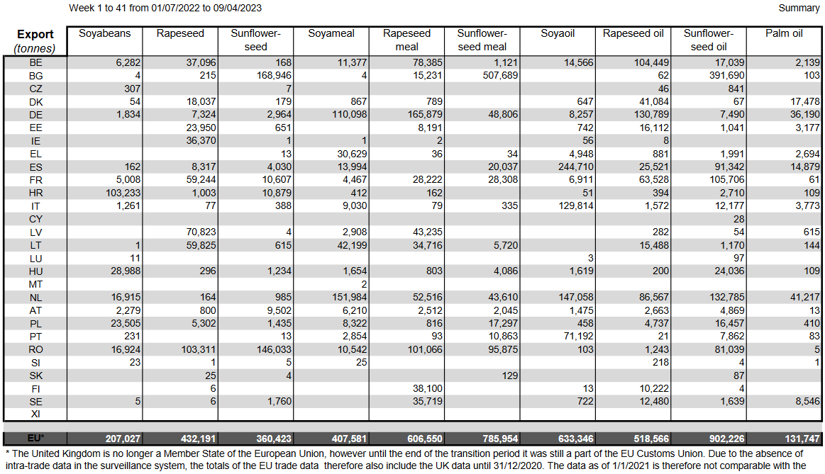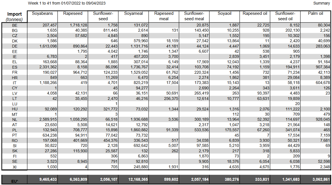 ЕС. Импорт - экспорт зерновых, масличных, растительного масла, шрота. Оперативные данные на 09.04.2023