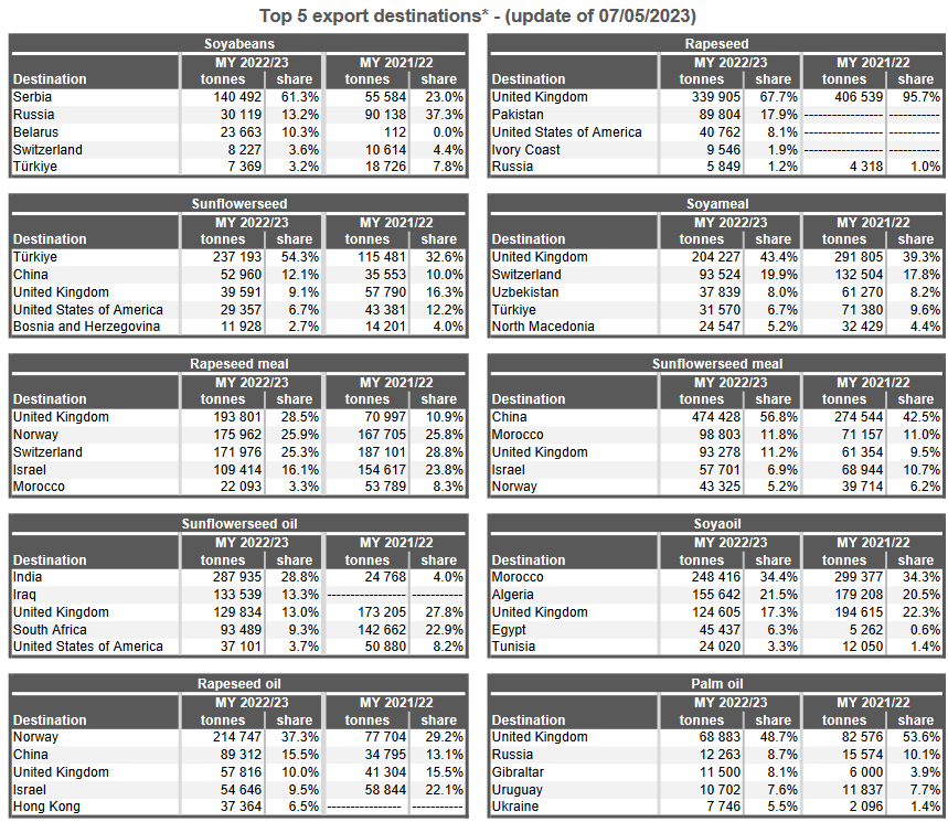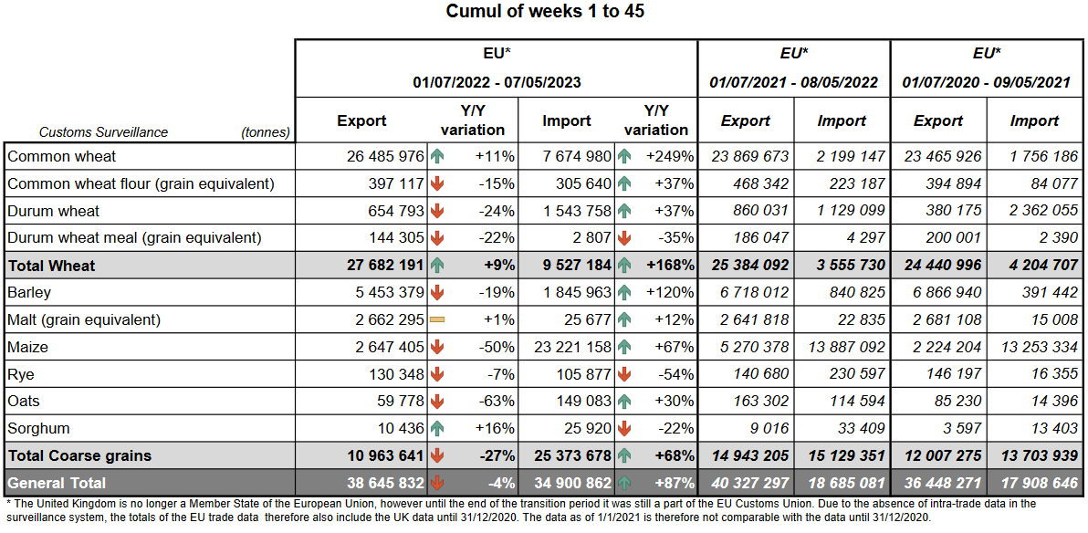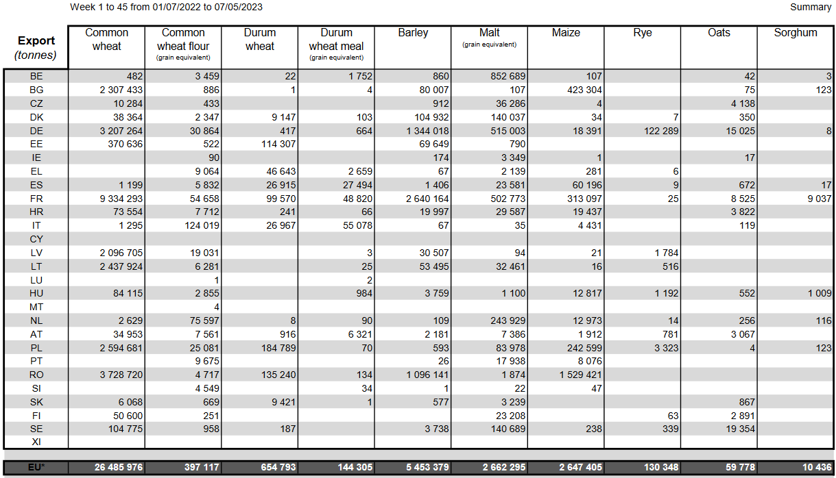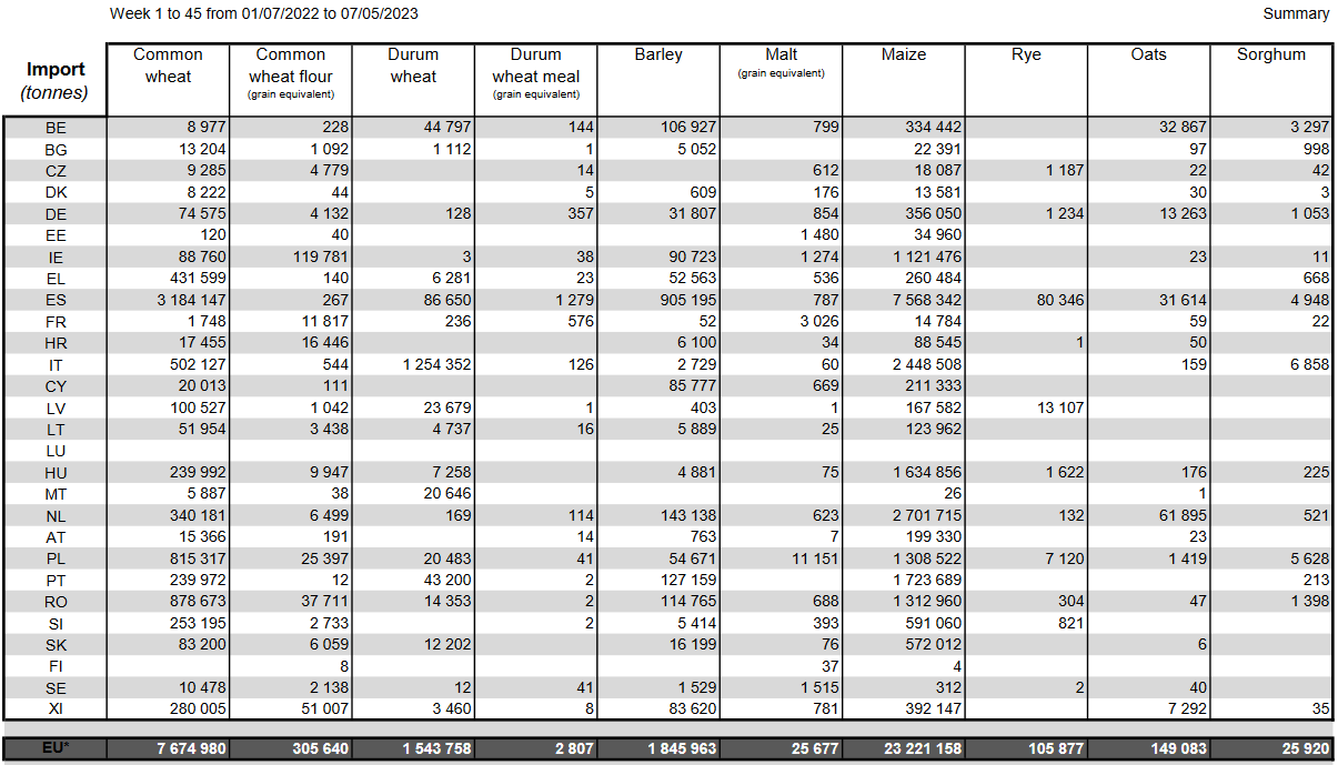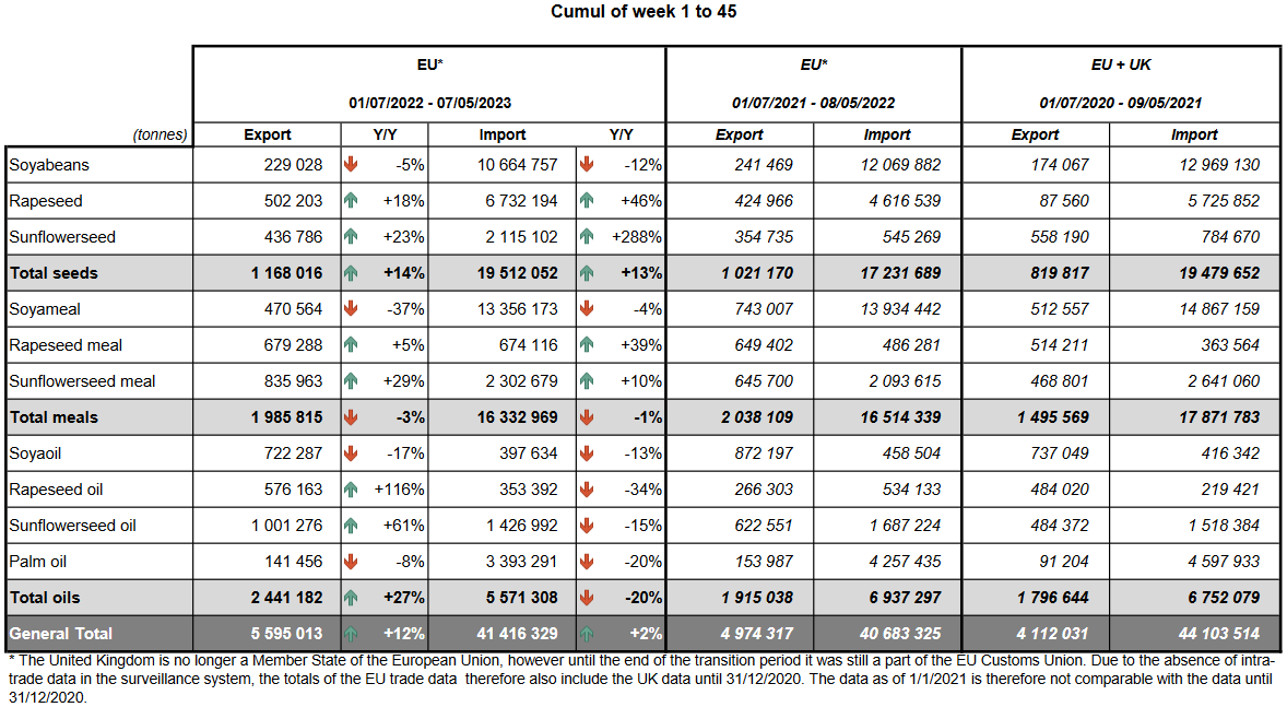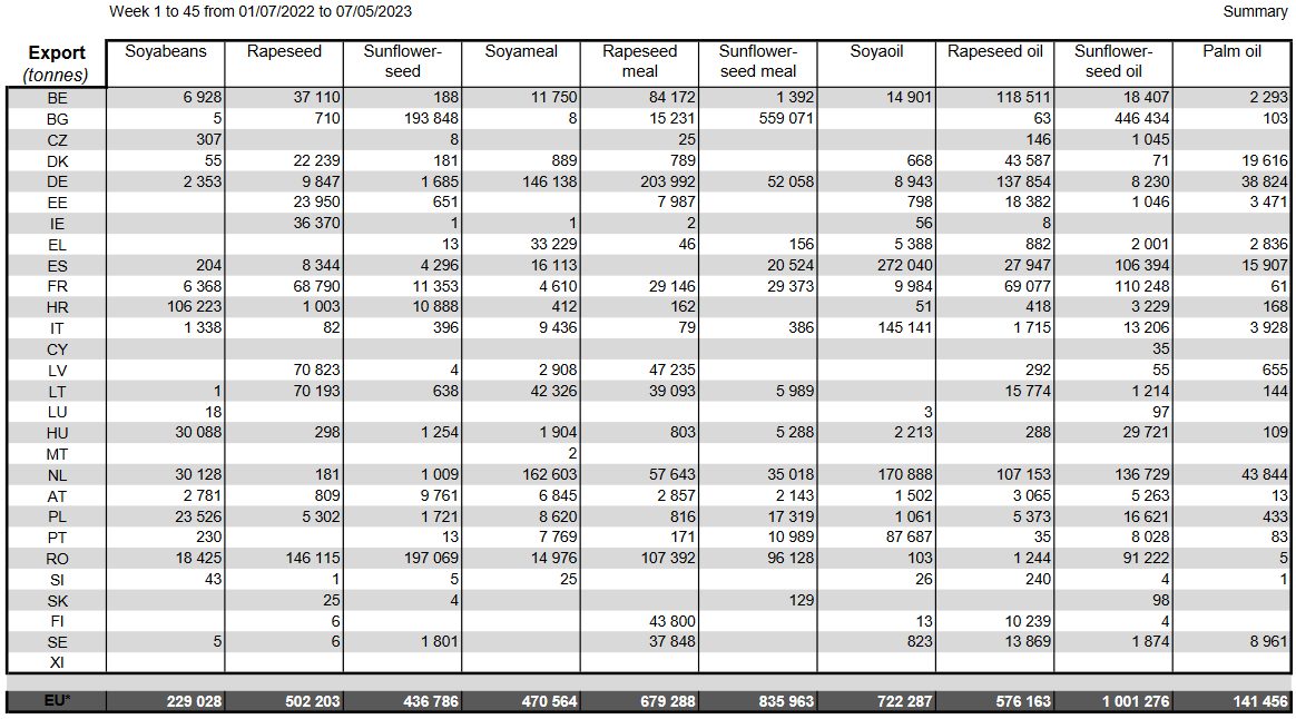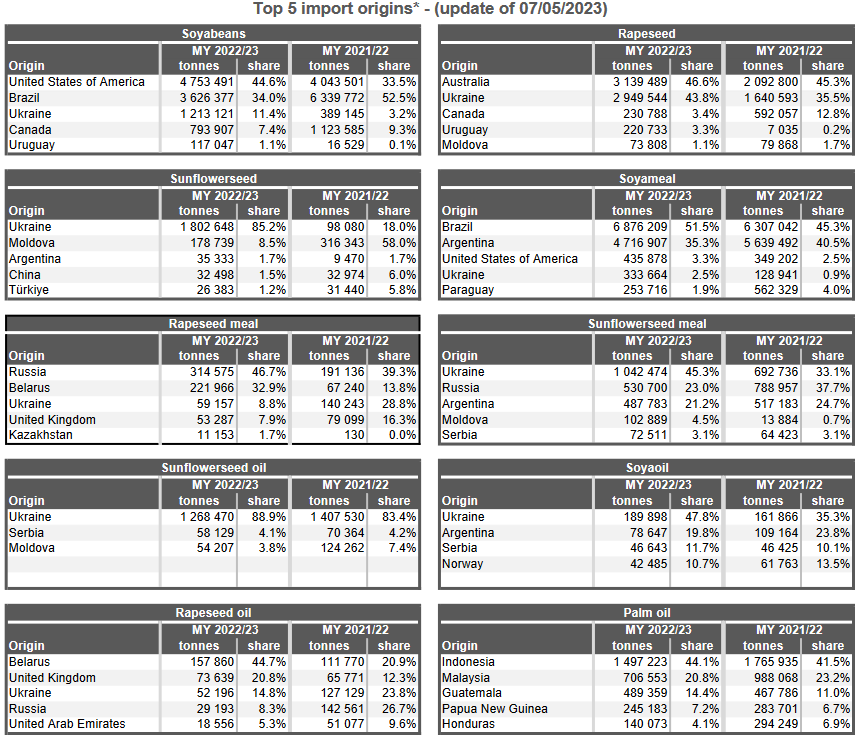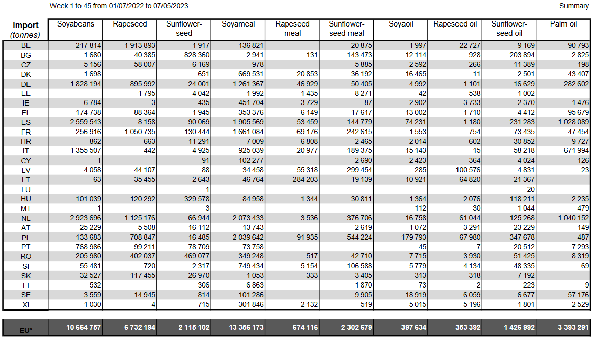 ЕС. Импорт - экспорт зерновых, масличных, растительного масла, шрота. Оперативные данные на 07.05.2023