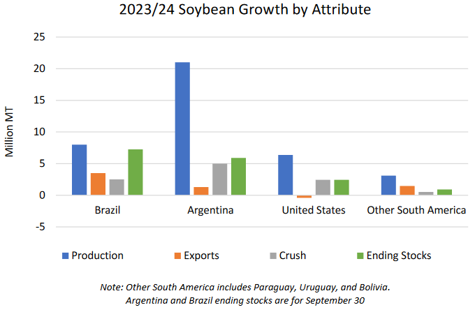 Прогнозируется, что мировое производство сои в 2023/24 году составит рекордные 410,6 млн тонн, что на 11% больше, чем 2022/23. Если это будет реализовано, производство сои в годовом исчислении увеличится на самый большой объем за более чем десятилетие, в основном за счет более высоких урожаев в Аргентине после исторической засухи в этом году. Аргентина приходится более половины прироста производства, в то время как на Бразилию, Уругвай и Парагвай приходится более четверти прироста производства как за счет расширения посевных площадей, так и за счет повышения урожайности во всех трех странах. Посевная площадь в Бразилии находится на рекордно высоком уровне благодаря высокой доходности и благоприятному обменному курсу, несмотря на ожидаемое снижение цен в 2023/24 году. Посевы в Соединенных Штатах, по прогнозам, не изменятся по сравнению с предыдущим годом, при этом ожидается прирост за счет более высокой урожайности.