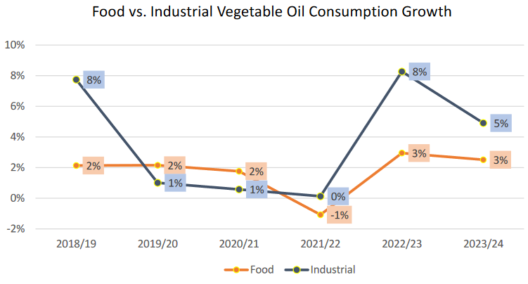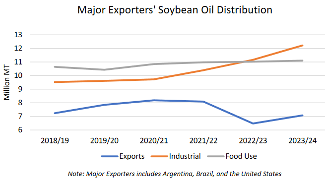 Потребление соевого масла, по прогнозам, вырастет на 5 процентов благодаря росту спроса на пищевые продукты в Китае и более высокому промышленному потреблению в Соединенных Штатах и Бразилии. Прогнозируется, что мировой экспорт вырастет на 8 процентов в 2023/24 году на фоне восстановления экономики Аргентины, но останется ниже предыдущих уровней из-за увеличения