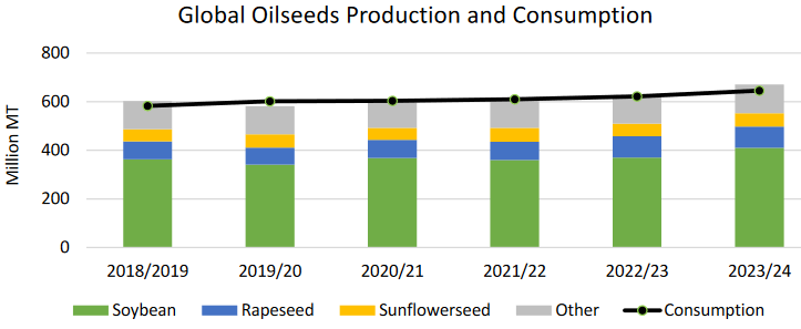 Прогнозируется, что мировое производство масличных культур в 2023/24 году вырастет на 7 процентов, в основном за счет роста производства сои в Южной Америке, а также семян подсолнечника в Европейском Союзе, Украине и России. Мировое производство рапса почти не изменилось, так как рост в ЕС, Канаде и Китае компенсируется снижением Австралим. Производство масличных культур прогнозируется на рекордном уровне 672,0 млн тонн, по сое прогнозируется рост на 11 процентов (40,0 млн тонн) до почти 411,0 млн. тонн.
