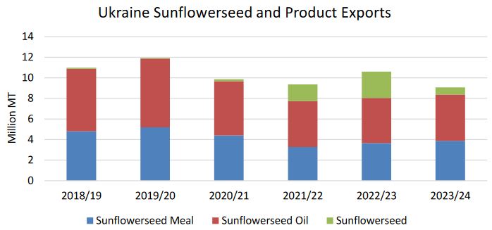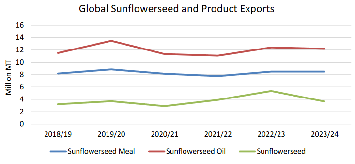 Потребление семян подсолнечника прогнозируется относительно неизменным. Мировой экспорт семян подсолнечника, по прогнозам, сократится на треть в этом году, поскольку Украина возобновляет переработку большей части своего урожая внутри страны.