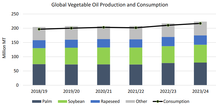 Мировая торговля растительным маслом в 2023/24 году несколько укрепится благодаря восстановлению объемов переработки сои в Аргентина, а также увеличение производства и экспорта пальмового масла из Индонезии.