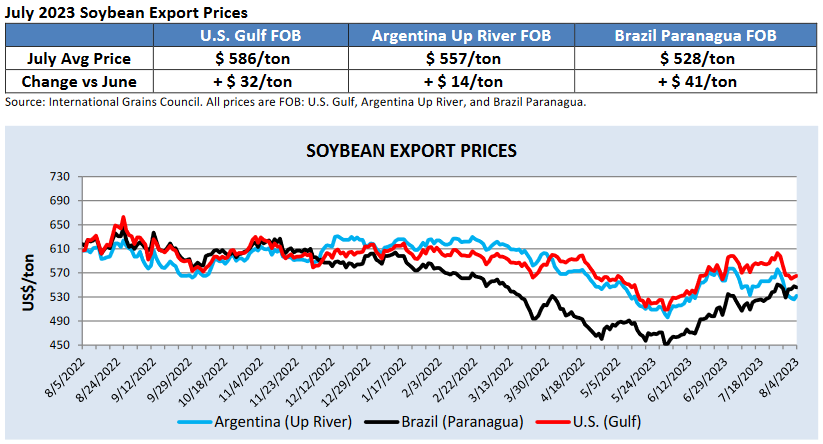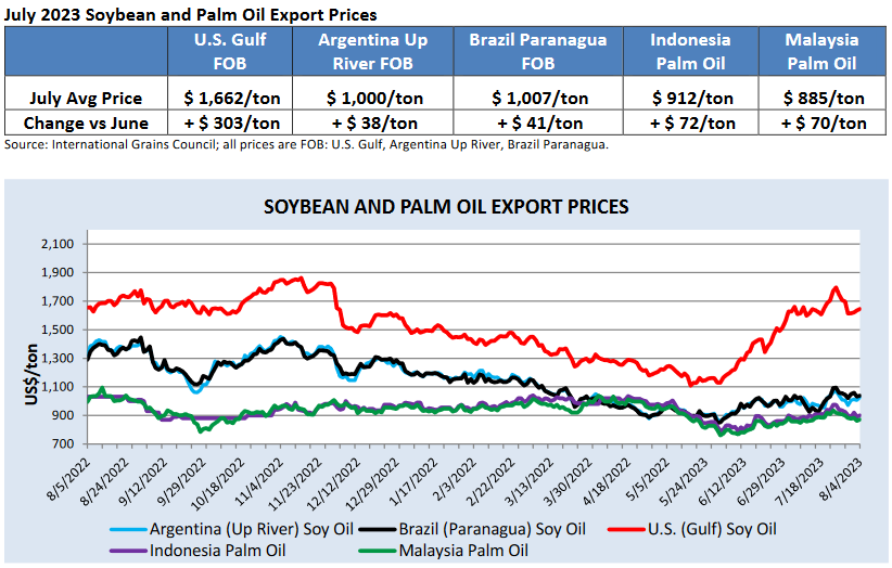 Соевое масло по-прежнему обеспечивало рост стоимости переработанной сои в июле, так как цены на другие растительные масла, пальмовое масло, по-прежнему поддерживаются высоким спросом. Экономические проблемы в таких странах, как Египет, Бангладеш и Пакистан снизили мировой спрос на продукты питания, удерживая цены на относительно низком уровне. Премия на соевое масло США по сравнению с другими экспортерами резко подскочила в этом месяце до более более 600 долларов за тонну, что обусловлено внутренним спросом на биотопливо, сокращением прогнозируемого производства сои в США, и ростом цен на рапсовое масло из-за засухи в Канаде.