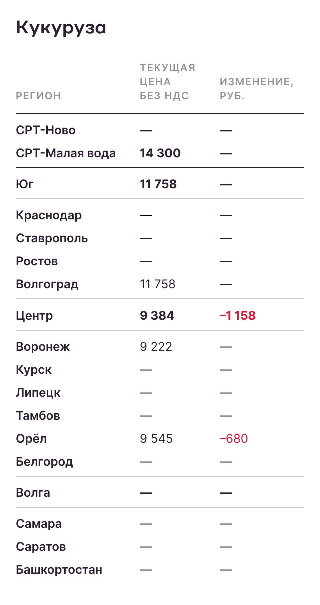 - Низкая активность на экспортном рынке в совокупности с поступлением нового урожая пшеницы и ячменя фактически обнуляет ликвидность по кукурузе.