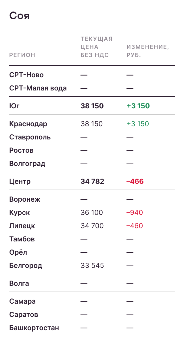 Цены на сою получили поддержку благодаря росту стоимости соевого масла и шрота вслед за удорожанием подсолнечного масла, а также из-за прямого влияния курса доллара на соевый комплекс России. Тем не менее старт уборки на Юге может привнести традиционное понижательное давление на ценовые котировки, в том числе, учитывая смежный интерес и загрузку заводов рапсом нового урожая. В Центре крупные игроки, например группы компаний «Содружество» и «Черкизово», наращивают мощности по переработке, что будет усиливать конкуренцию за объемы и может сказаться на увеличении премии к цене в Центральной части России.
