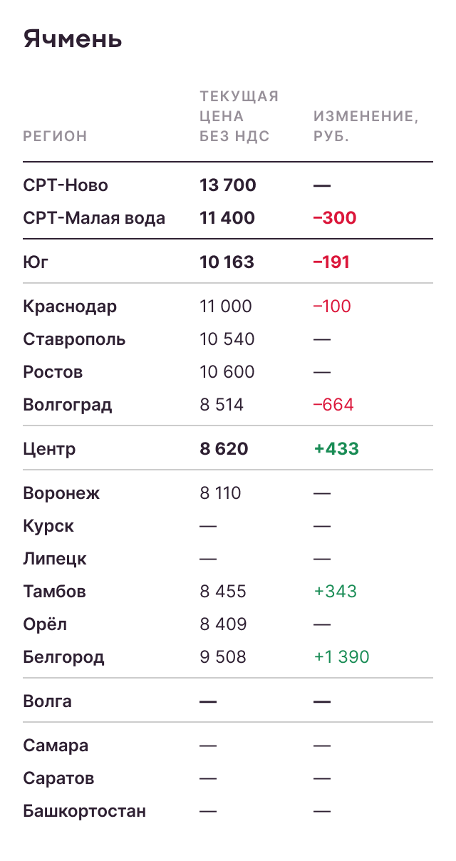 - Минимальная маржинальность фермеров при продаже ячменя в данный период сезона снижает их готовность к реализации урожая.