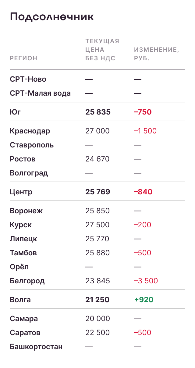 Цены на подсолнечник в России последние несколько недель стагнируют в ожидании понятных сигналов со стороны рынка — как в сторону поддержки, так и в сторону понижения. На сегодняшний день рынок выглядит более «медвежьим» на фоне старта уборки, демпинга со стороны Украины в части подсолнечного масла, высоких переходящих запасов сырья в России. Наиболее вероятным видится просадка цен в течение сентября-октября, однако поддержка может быть оказана ростом мирового спроса на подсолнечное масло, которое пока является наиболее конкурентоспособным на мировом рынке.