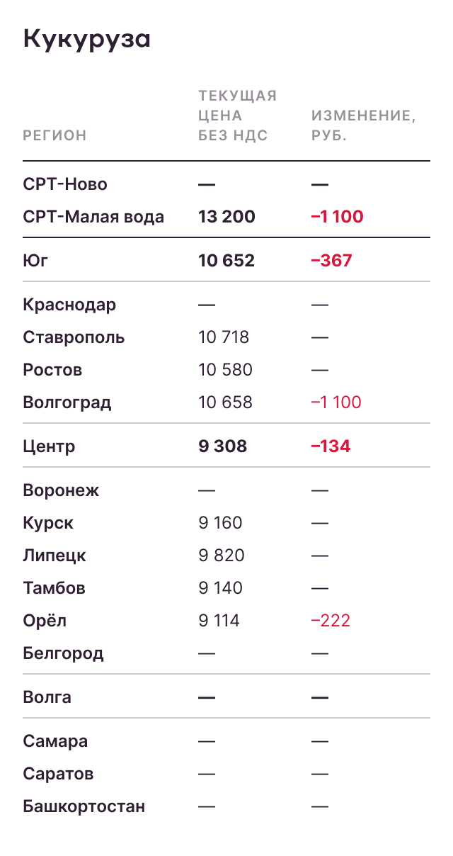 В преддверии старта уборки кукурузы нового урожая на Юге России текущий экспортный рынок остается актуальным только для Каспийского направления, где продолжаются отгрузки в Иран. Цены на СРТ Астрахань снизились до 16 000 рублей за тонну без НДС. Активности экспортеров в глубоководных портах пока нет, однако вероятнее всего первые уровни можно будет увидеть в течение 1–2 недель. В целом мировой рынок находится под влиянием «медвежьего» тренда на фоне высокой конкуренции США и Бразилии, а также с учетом старта уборки кукурузы в Европе, Украине и России.