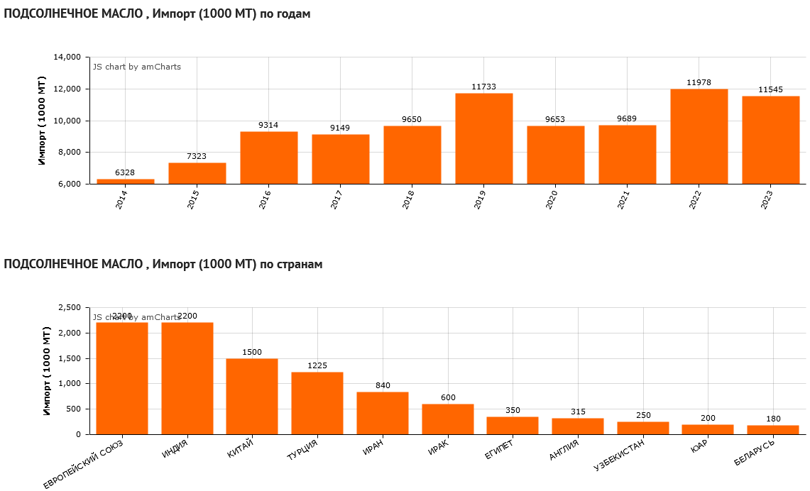 Подсолнечное масло, прогноз импорта по странам на сезон 23/24 - USDA