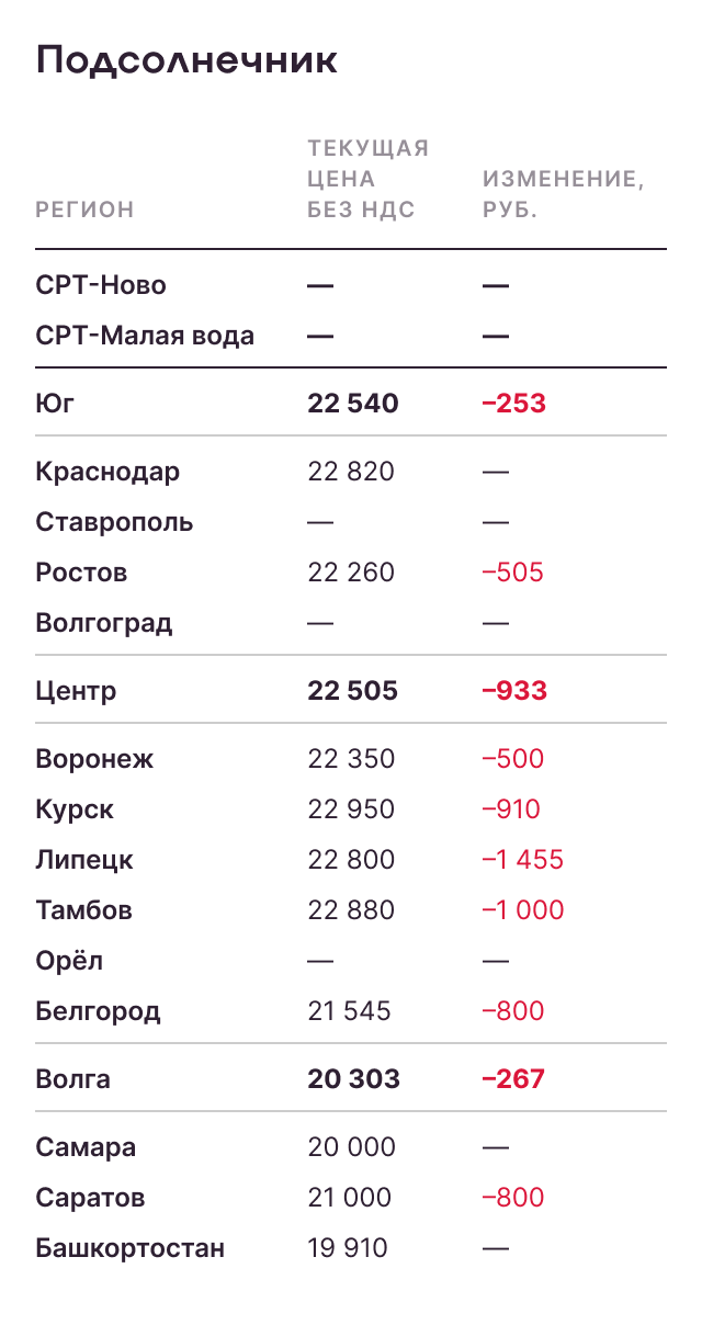 Цены на подсолнечник нового урожая в регионах Юга и Центральной части России зафиксировались после снижения, поскольку спрос заводов возрос в достаточной степени, чтобы сбалансировать предложение на рынке макрорегионов. Рост ограничен снижением мировых цен на масло, а также стабилизацией курса доллара. Тем не менее для переработчиков в России текущие цены являются более чем комфортными, в связи с чем в ближайшие 2–3 недели ожидается тренд на стабилизацию близ текущих уровней.
