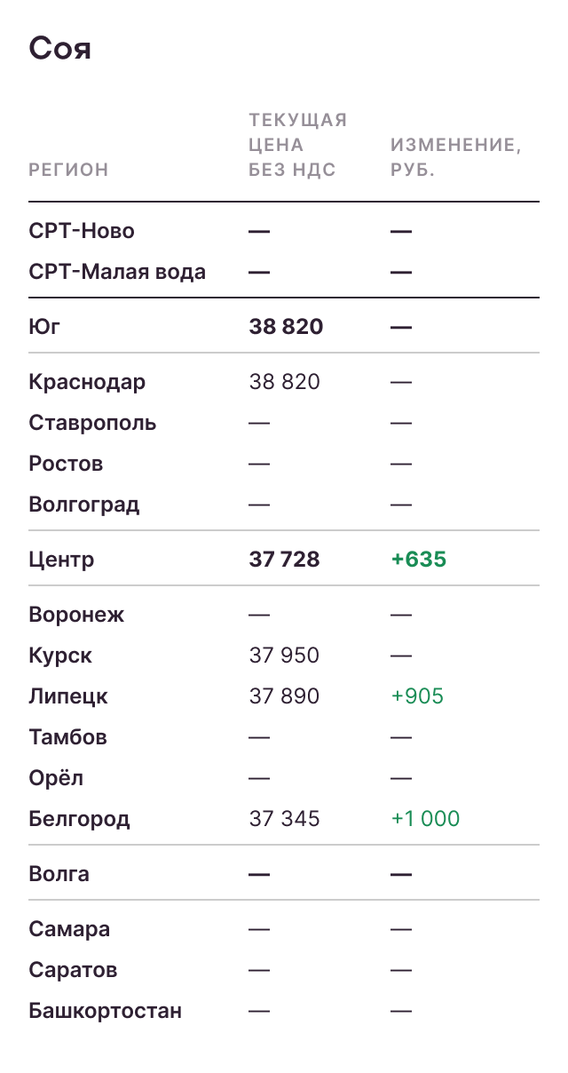 Цены на сою почти не показали снижения на старте сезона, что связано с высоким спросом со стороны внутренних потребителей, которые подошли к новому урожаю с минимальным запасами и сейчас активно закупают культуру. С учетом роста темпов уборки в Центре ожидается, что текущий ажиотаж спадет в ближайшие две недели, что может повлечь за собой и понижение закупочных цен. Этому будет также способствовать снижение мировых цен на сою и шрот на фоне роста конкуренции с новым урожаем в США.