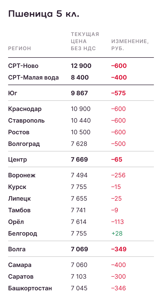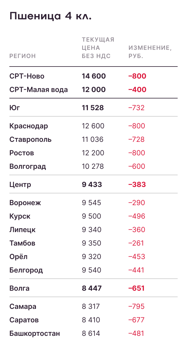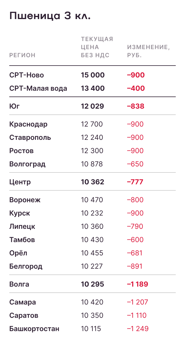 - Затоваривание в портах и на складах у сельхозпроизводителей ведет к лавинному падению цен, несмотря на «негласные» минимальные уровни реализации пшеницы — $270 за тонну FOB, или 17 000 рублей за тонну без НДС (СРТ).