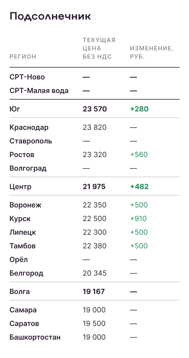 Цены на подсолнечник растут в регионах Юга и Центра, что стало реакцией на конкурентную борьбу заводов за сырье. Повышать цены им позволяет комфортно высокая маржинальность и недавний рост стоимости реализации подсолнечного масла. Несмотря на то что предложение подсолнечника на рынке велико, отрасль видит перспективы более высокого импортного спроса на подсолнечное масло из России в текущем сезоне, что будет влиять и на цены готовой продукции. Также стоит ожидать рост спроса на подсолнечный шрот, в том числе со стороны Китая, на фоне снижения украинского потенциала и роста цен в смежном сегменте — на соевый шрот.