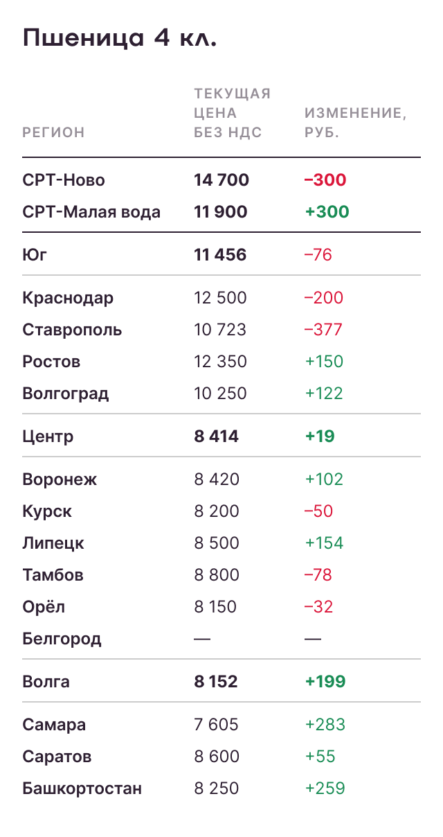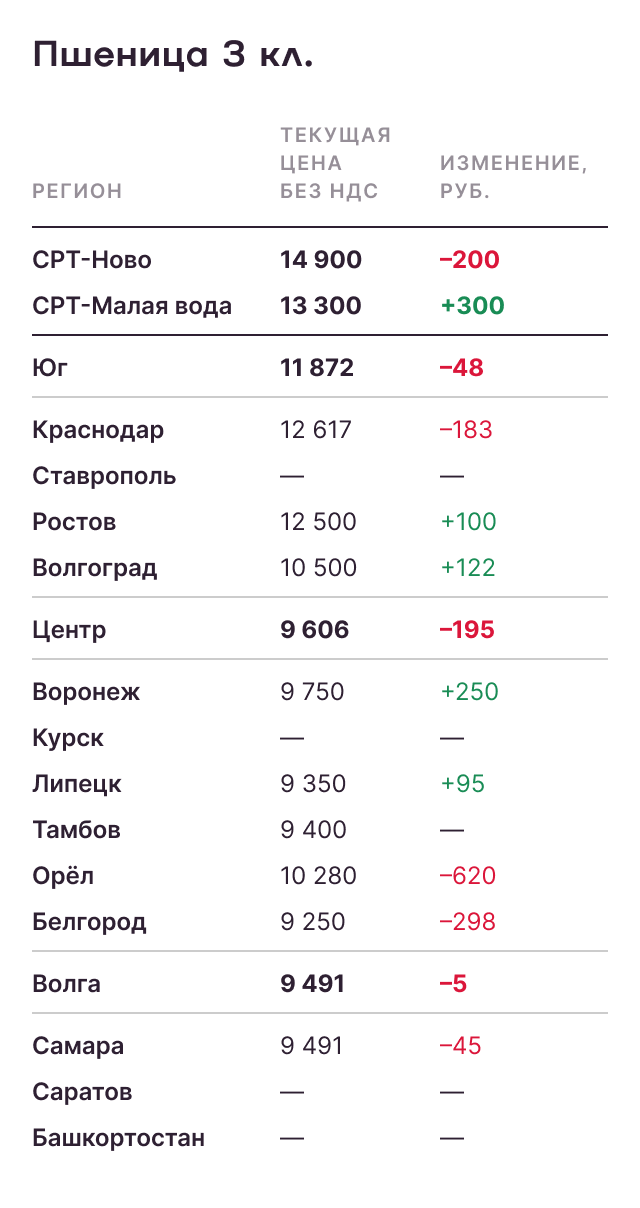 Стоимость пшеницы в российских портах «большой воды» вновь снижается, несмотря на появившиеся ранее факторы к росту. Разворот может быть связан как с прямой реакцией на укрепление рубля до как минимум 96 рублей за доллар, так и с продолжающимся снижением цены FOB до $230 за тонну, несмотря на результаты тендера Египетского госагентства по закупкам продовольствия (GASC), который закрылся значительно дороже. Отдельно стоит отметить активизацию спроса на пшеницу на «малой воде» в направлении Турции, что подстегнуло к росту рублевые цены на базисе СРТ-порт. Однако, что касается глубоководных портов, расчетный уровень паритета указывает на еще более глубокую просадку в течение ближайшей недели.