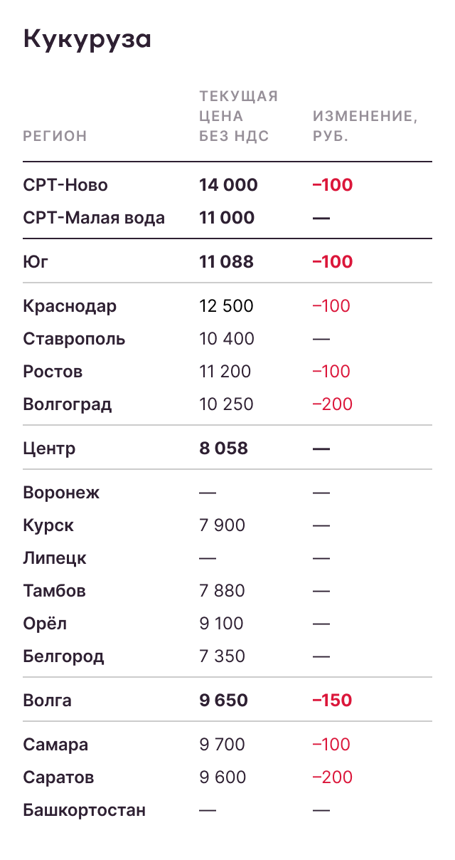 Экспортный рынок кукурузы остается на прежнем уровне, цены выше расчетных, что объясняется наличием премии к цене российской кукурузы в сравнении с котировками на украинскую продукцию. В силу различных рынков сбыта, Россия имеет преимущество на коротком плече (Турция, Иран). Тем не менее пока более высокого уровня цен оснований ожидать нет.