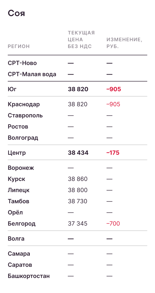 Цены на сою в России остаются на стабильном уровне — 44–45 тыс. рублей за тонну. С одной стороны, соевый комплекс, прежде всего соевое масло, растет в цене на фоне укрепления котировок подсолнечного масла, тогда как соевый шрот испытывает давление из-за динамики курса, которая давит на рублевую стоимость. С учетом более чем достаточного предложения соевых бобов на рынке РФ в данный момент, наиболее вероятен боковой тренд. Однако еще раз стоит подчеркнуть, что цены во многом будут зависеть от мировой конъюнктуры.