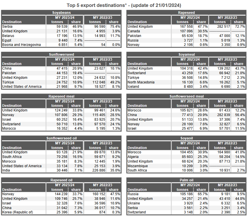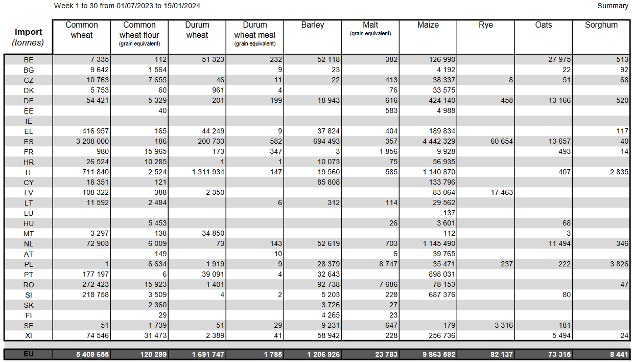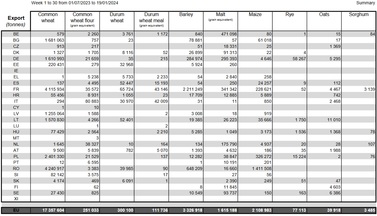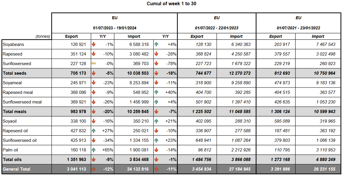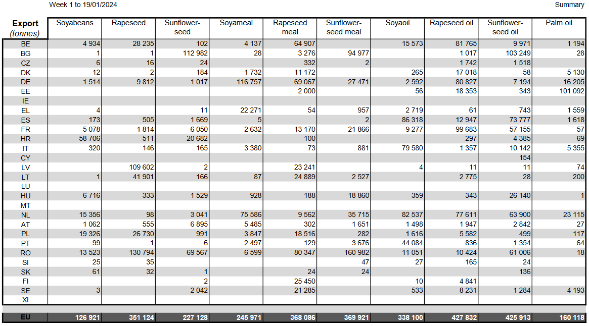 ЕС. Импорт-экспорт зерновых, масличных, растительного масла, шрота на 19.01.24 г.