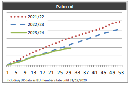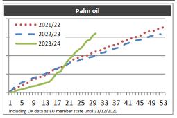 Импорт соевого шрота составил 8,25 млн тонн против 9,26 млн годом ранее, а импорт пальмового масла составил 1,90 млн тонн против 2,21 млн годом ранее.