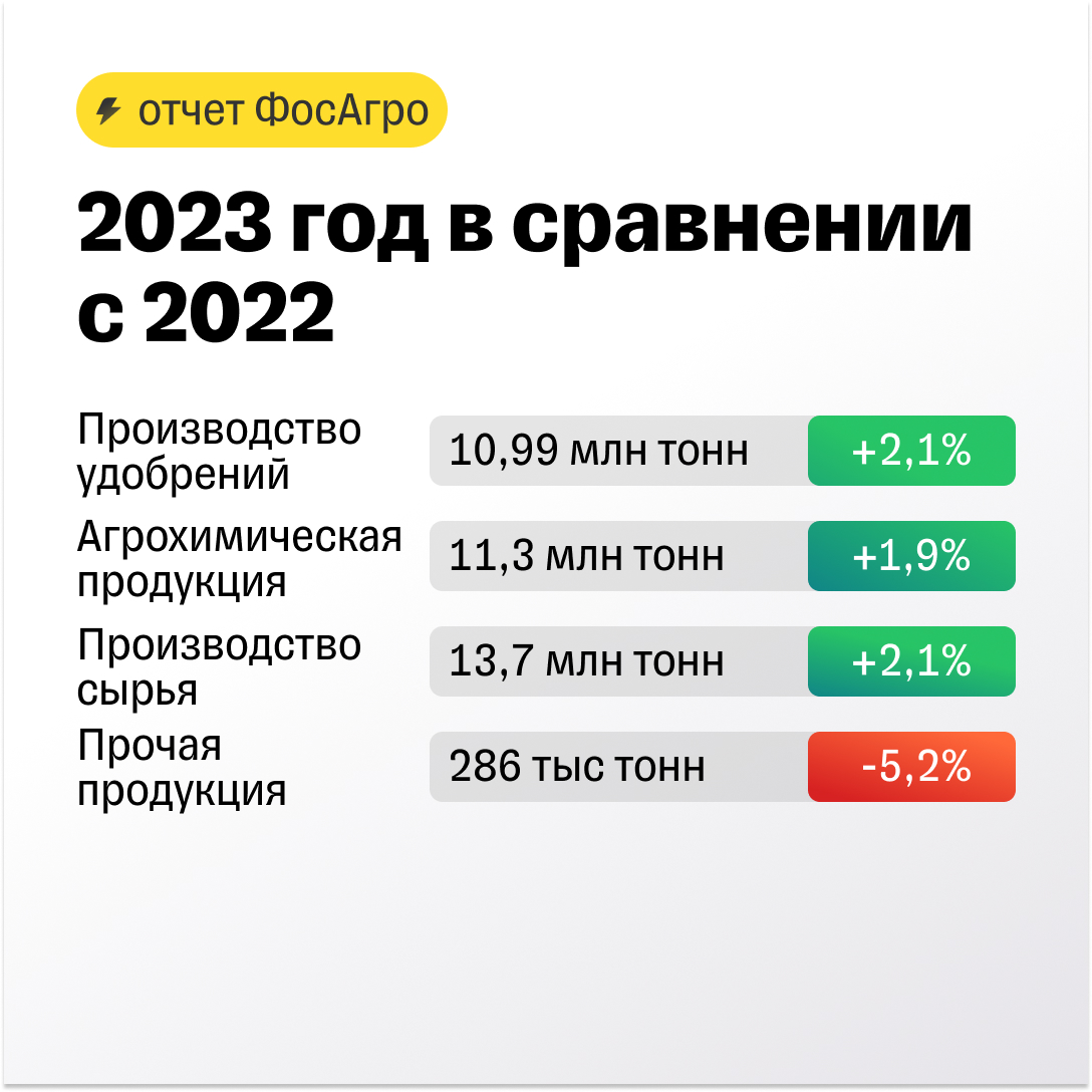 Лидер производства фосфорных удобрений — компания ФосАгро опубликовала операционные результаты бизнеса за 2023 год. Компании удалось побить прошлогодний рекорд по выпуску агрохимической продукции, увеличив результат до 11,3 млн тонн.