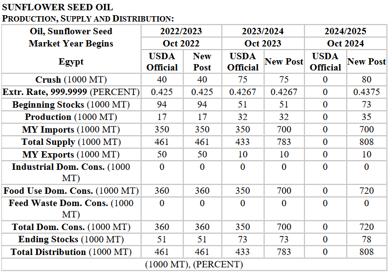 Post прогнозирует, что импорт подсолнечного масла в Египет в 2024/25 МГ составит 700 000 тонн, что обусловлено возможными конкурентоспособными ценами и более широкое использование при смешивании с соевым маслом для программы субсидирования Египта. Post пересматривает в сторону повышения свою оценку поставок подсолнечного масла на 2023/24 МГ до 700 000 тонн. Россия и Украина значительно увеличили свой экспорт на египетский рынок, они смогли предложить подсолнечное масло дешевле соевого масла и с небольшой надбавкой к пальмовому маслу. В 2023/24 году (октябрь-март) экспорт подсолнечного масла в Египет составил 483 828 тонн по сравнению с 217 406 тонн за тот же период предыдущего маркетингового года, сообщает oilworld.ru со ссылкой на USDA.