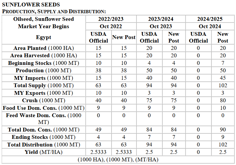 Post прогнозирует, что производство семян подсолнечника в Египте в 2024/25 МГ (октябрь – сентябрь) составит 50 000 тонн. Для поддержания производства и увеличения выращивания заключен договор с гарантией цены. между производителями и заинтересованными сторонами, а также более широкое распространение сертифицированных семян подсолнечника среди производители. Семена подсолнечника (в первую очередь сортов Саха 53 и Гиза 102) высаживают по всей территории Дельты. регионе (северный Египет) в мае, а также в Среднем и Верхнем Египте, но обычно начинаются в июне....
