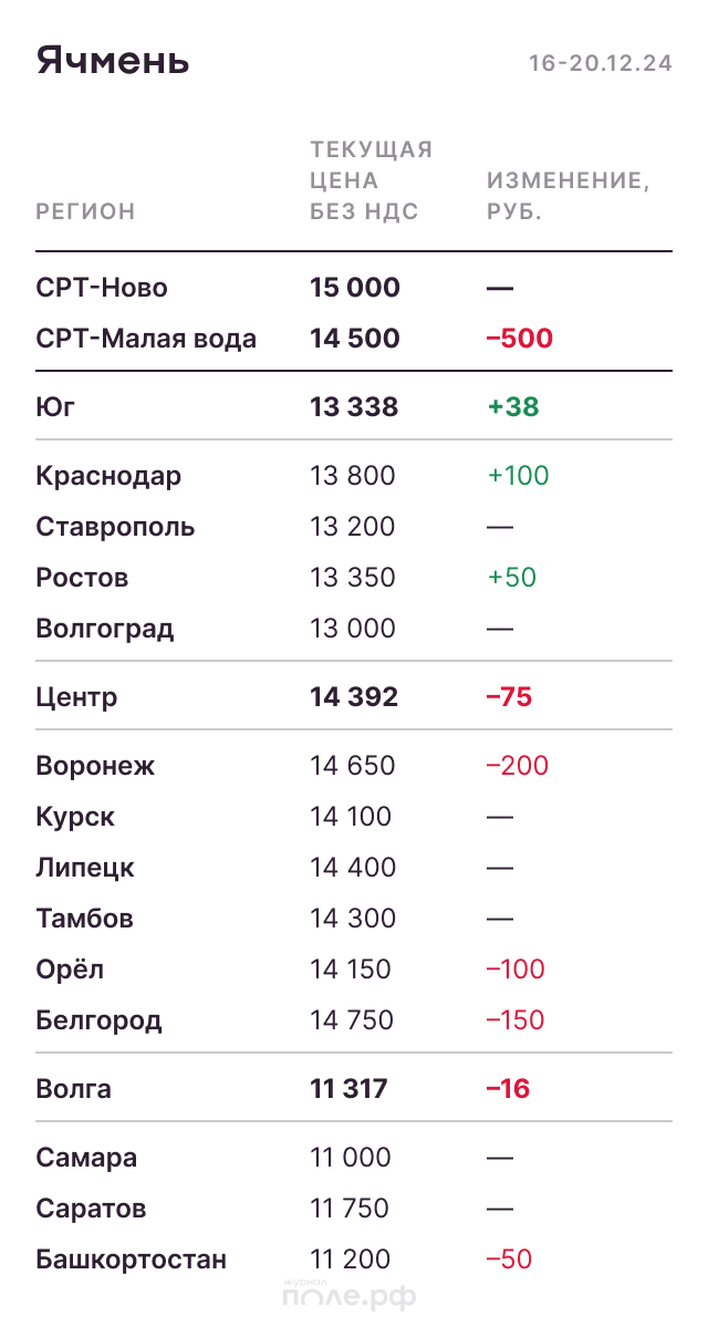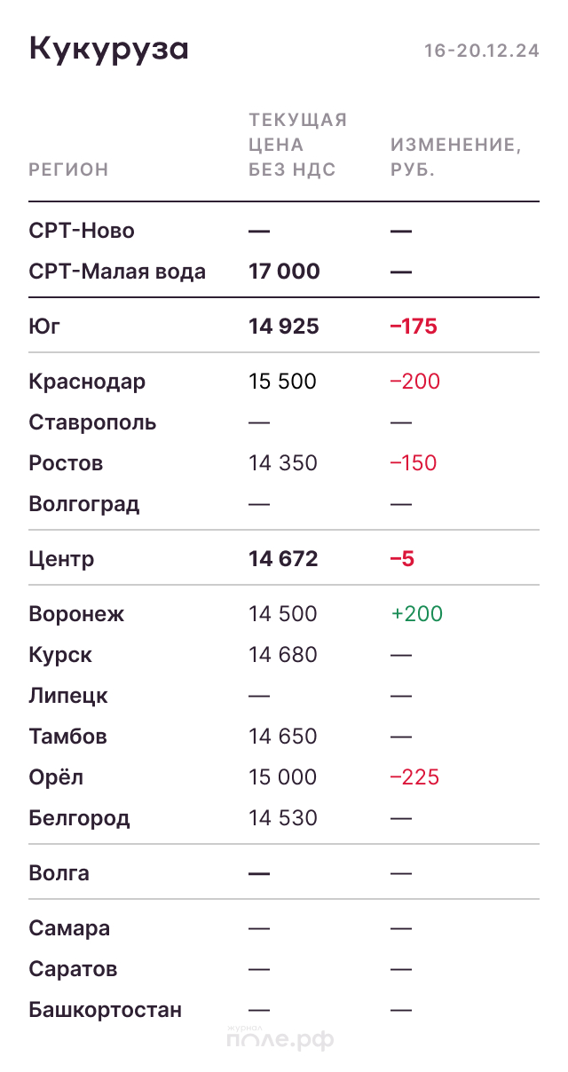 Ячмень остается в прежнем диапазоне, тогда как отгрузки замедляются в соответствии с ожиданиями. С учетом текущего лайн-апа экспорт в декабре может достигнуть 200 тыс. тонн, что станет худшим показателем для этого месяца с 2016 года. Причины — сверхактивный старт (июль-ноябрь) и существенно более низкий экспортный потенциал в текущем сезоне на фоне снижения валового сбора. Несмотря на ожидание роста цен на базисе FOB, рублевая стоимость (СРТ) будет оставаться близ текущих уровней в ближайшее время. Фактически реализация ячменя все более фокусируется на внутренний рынок, который дает более выгодную цену.